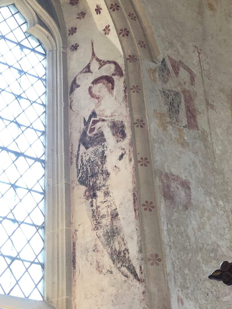 Image: The Virgin Mary. Wall painting on the East splay of the Annunciation window (north wall) in the Chancel of the Church of St Mary the Virgin, Chalgrove, Oxfordshire. Photo by Dr Michelle Castelletti.